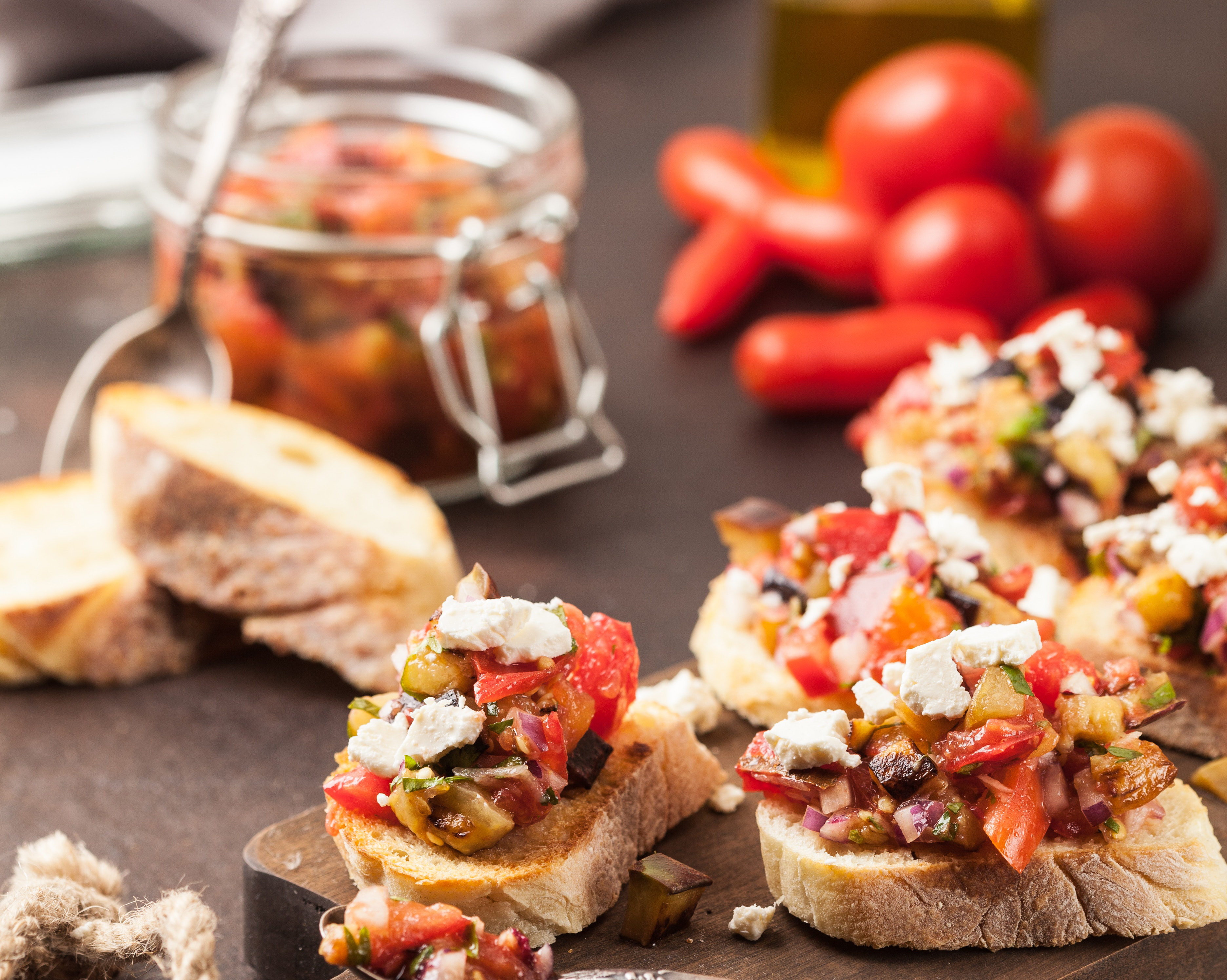 Faites revenir des courgettes, de l’oignon et des aubergines coupées en dés à la poêle avec un filet d’huile d’olive. Dans une baguette tranchée en deux, tartinez de la sauce tomate, puis disposez votre mélange. Ajoutez des tranches de mozzarella, un filet d’huile d’olive et un peu d’origan. Passez la tartine au four pour faire fondre le fromage, en quelques minutes, vous avez revisité la traditionnelle pizza !