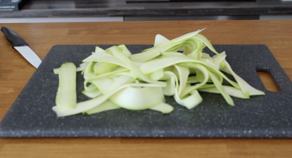 Coupez les extrémités des courgettes et épluchez-les. Coupez-les ensuite en tagliatelles très fines à l’aide d’un économe.