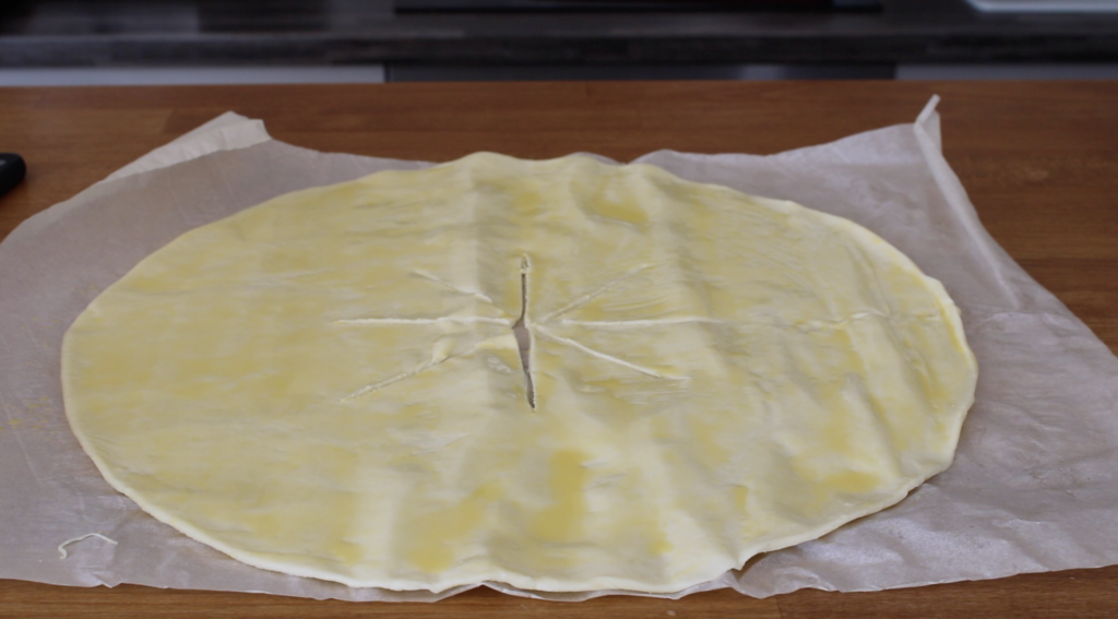 Etalez la pâte feuilletée. Avec un couteau, coupez 8 triangles au centre de la pâte. Badigeonnez la pâte d’un jaune d’oeuf.