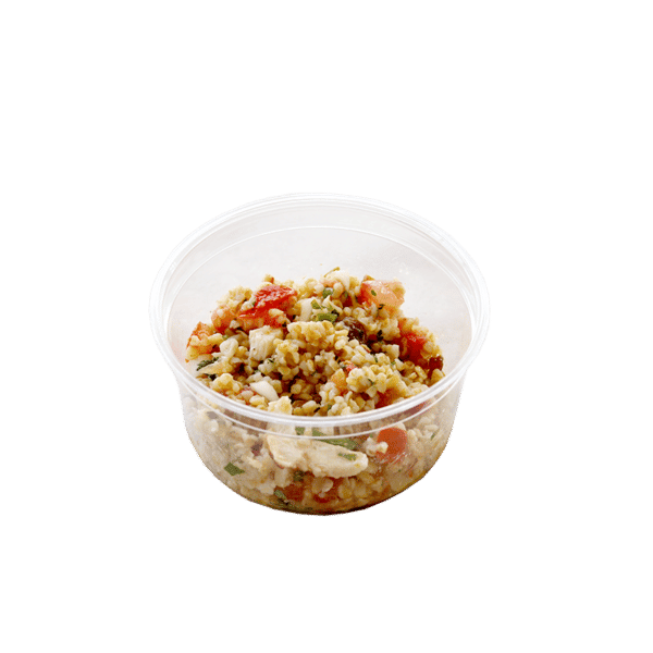 Petite salade individuelle de boulgour au poulet (boulgour, poulet, tomate, raisin, oignon, coriandre) à l'huile d'olive et vinaigre de Xérès
