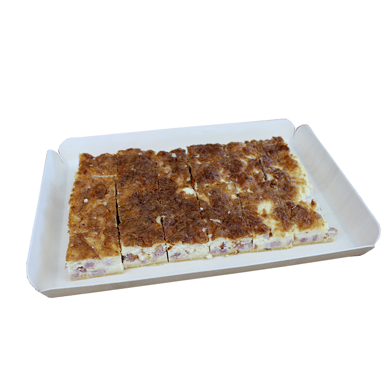 Courgette 21%, Féta (LAIT) 21%, farine (GLUTEN), ŒUFS, LAIT, huile d’olive, levure chimique (Poudre à lever (pyrophosphate de soude E450i – bicarbonate de soude E500ii), amidon de froment (GLUTEN), farine de froment (GLUTEN)(Suceptible de contenir : LAIT)), sel, poivre.