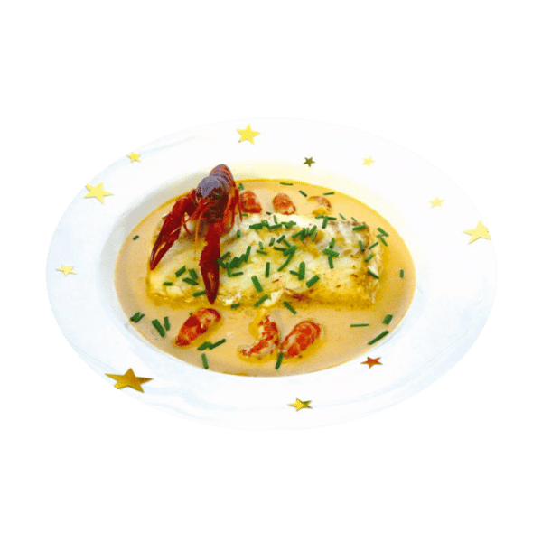 Dos de Cabillaud 30%(POISSON), crème (LAIT), bisque de CRUSTACEES, queue d’écrevisse 8% (CRUSTACEE), huile d’olive, échalote, persil, jus de citron, Fumet CRUSTACEE, cognac, concentré de tomate, sel, poivre.