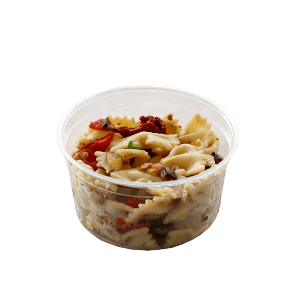 Farfalle 33% (Semoule de blé dur(GLUTEN)), tomate 11%,courgette 11%, tomate séchée 11% (SULFITES), aubergine 10%, poivron rouge 10%, grana padano (LAIT), basilic corse, vinaigre balsamique blanc(SULFITES), ciboulette, huile d’olive, sel, poivre.