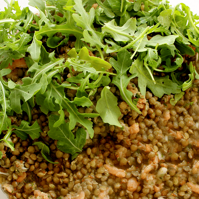 Petite salade individuelle de lentilles au saumon (lentilles, saumon fumé, roquette, échalote et persil) au vinaigre de Xérès et à la moutarde