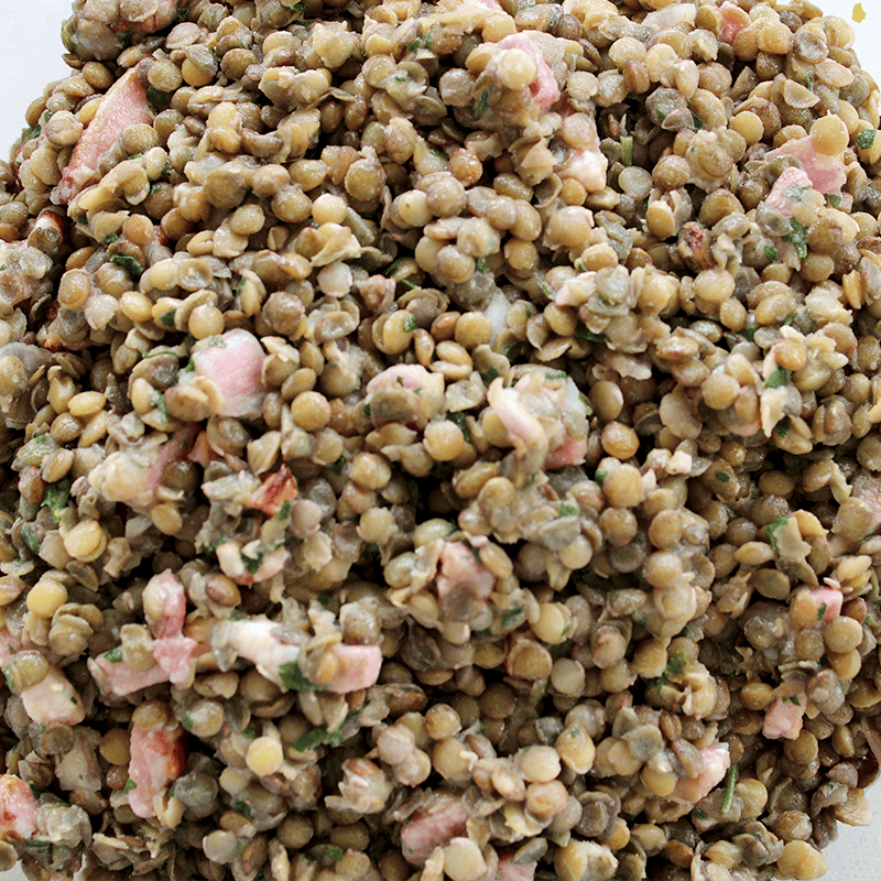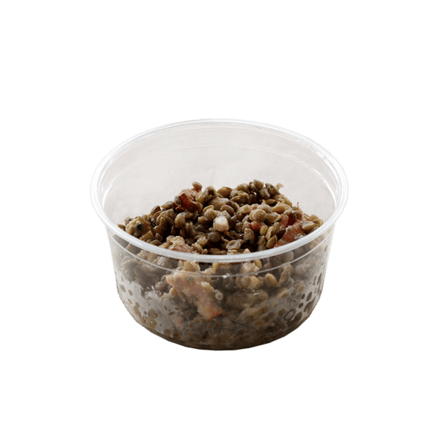 Lentilles 46%, lardons 21%, huile de tournesol, echalote, MOUTARDE (Eau, graines de moutarde, vinaigre d’alcool, sel ; antioxydant : disulfite de potassium, acidifiant : acide citrique), Vinaigre de Xeres et de vin (SULFITES), persil, sel, poivre.