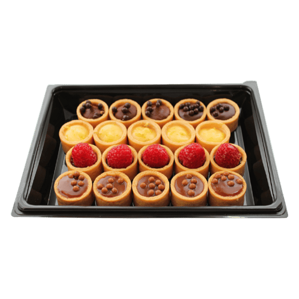 Composition fond tartelette sucré : Farine de blé (GLUTEN), beurre (LAIT), sucre, OEUF, extrait naturel de vanille, sel. Glaçage : sucre, huile végétale (huile de palme, huile de coco, huile de palmiste), sirop de glucose, émulsifiant : lécithine de soja (E322), extrait naturel de vanille).