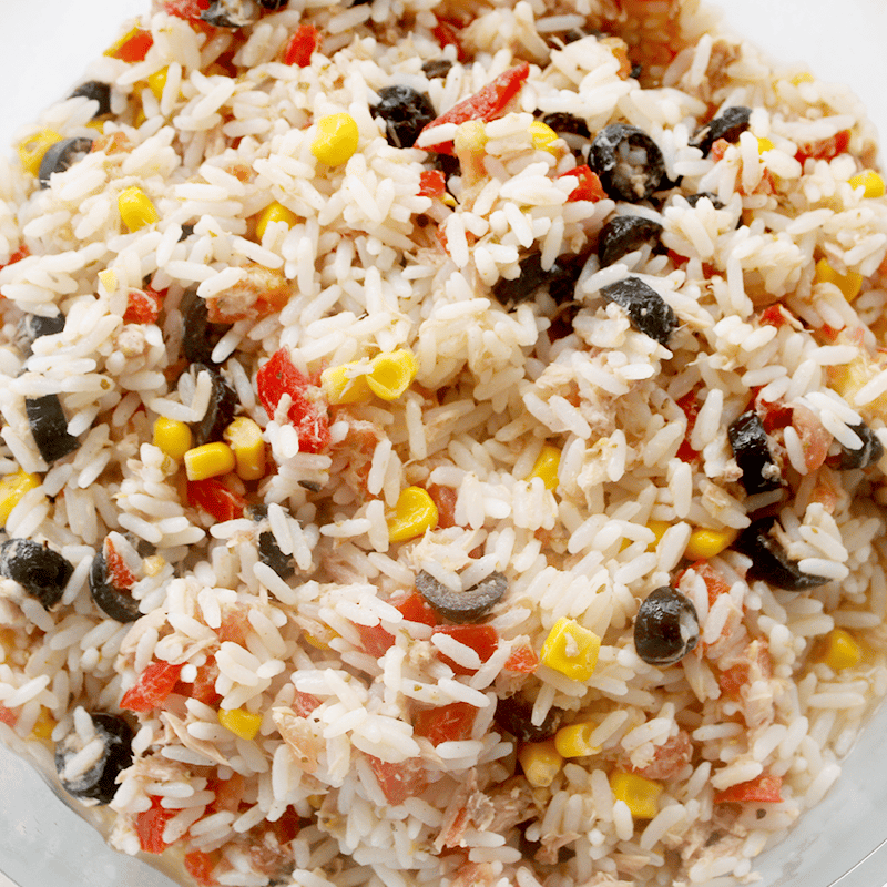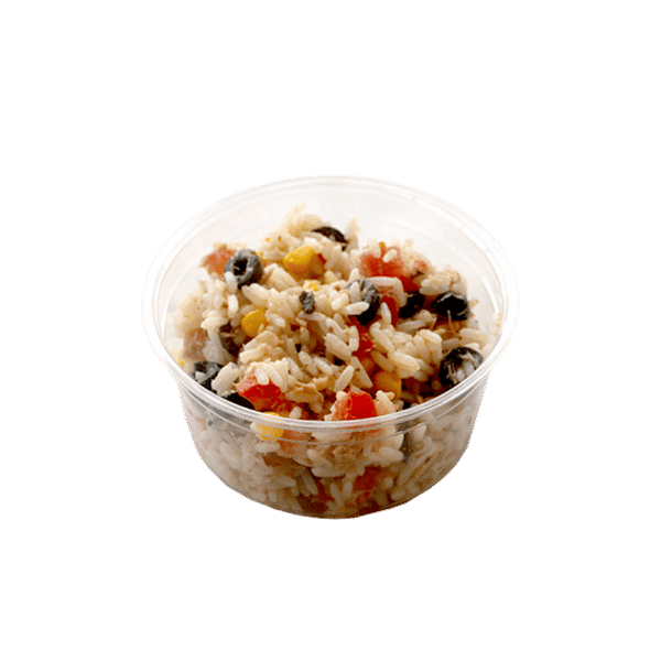 Riz 34%, thon 17% (POISSON), tomate, maïs, poivrons, huile de tournesol et d’olive, olive noire, vinaigre balsamique blanc (SULFITES), origan, sel, poivre.