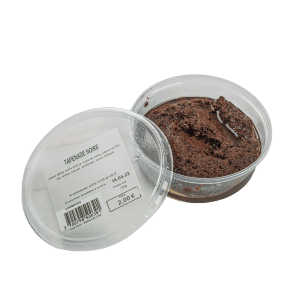 Olive noire à la Grecque (75%), câpre (8%), huile d’olive vierge extra (8%), anchois (4,5%), ail frais (2%), herbes de Provence (0,5%), poivre gris ( 0,25%)